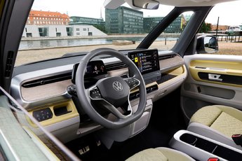 The cockpit of the ID. Buzz is equipped with two displays: a 5.3-inch ID. Cockpit and a 12.9-inch central infotainment screen. It supports wireless connectivity and includes multiple USB-C ports along with a 110V outlet. The ID. Light, a light strip below the windshield, offers intuitive driving assistance. Its IQ.DRIVE technology, standard in the vehicle, provides lane centering and obstacle alerts for enhanced safety and convenience.
